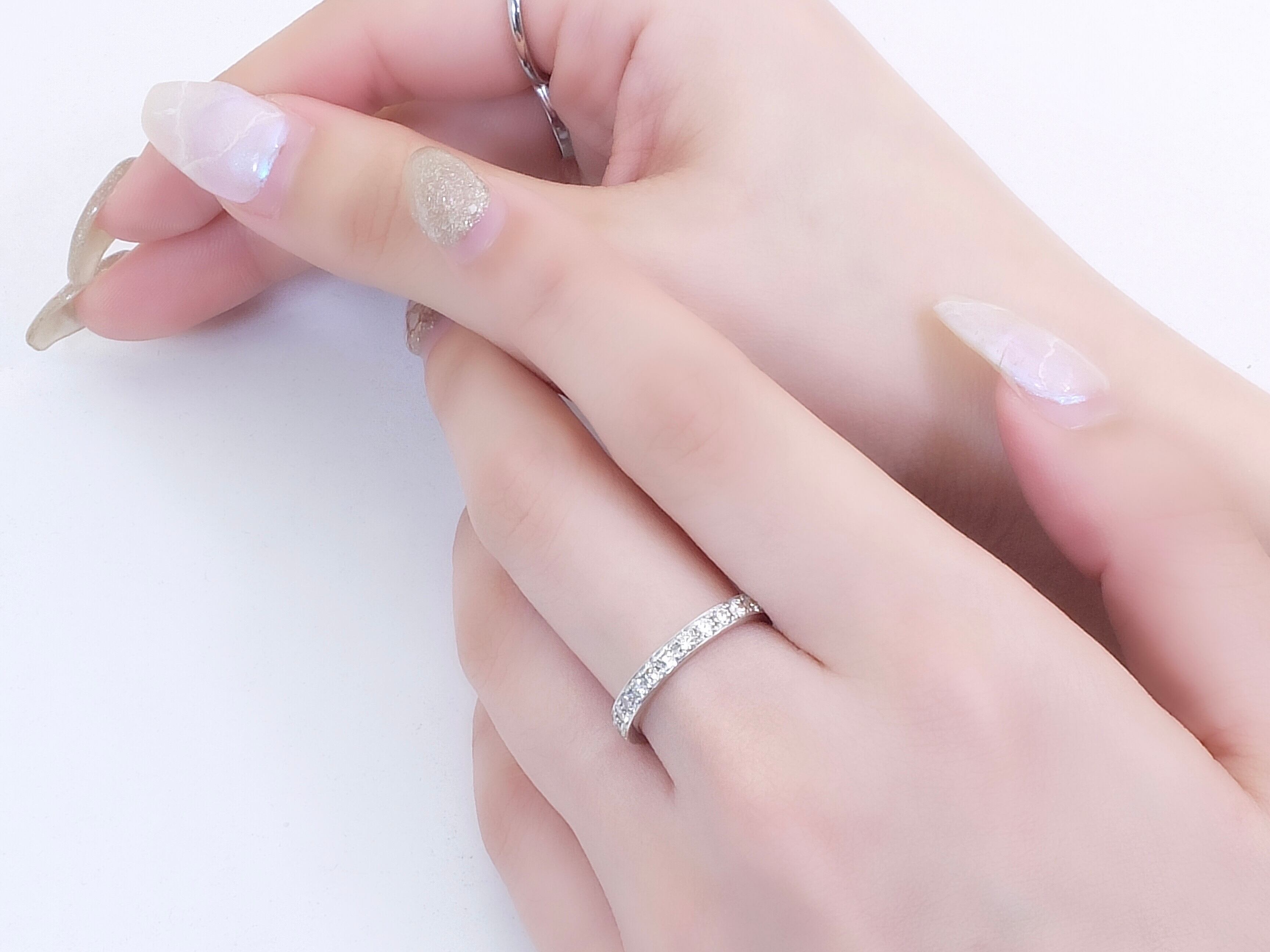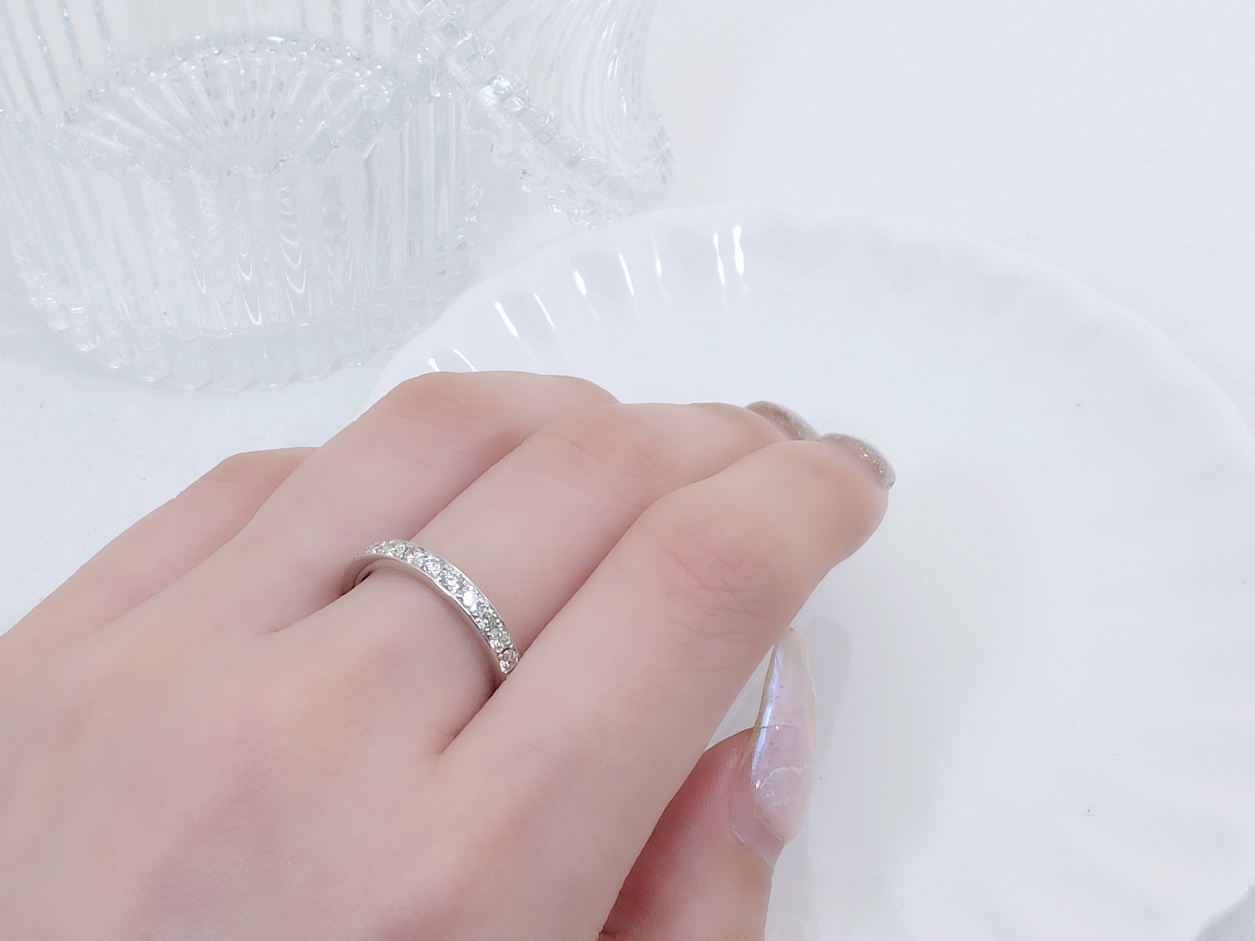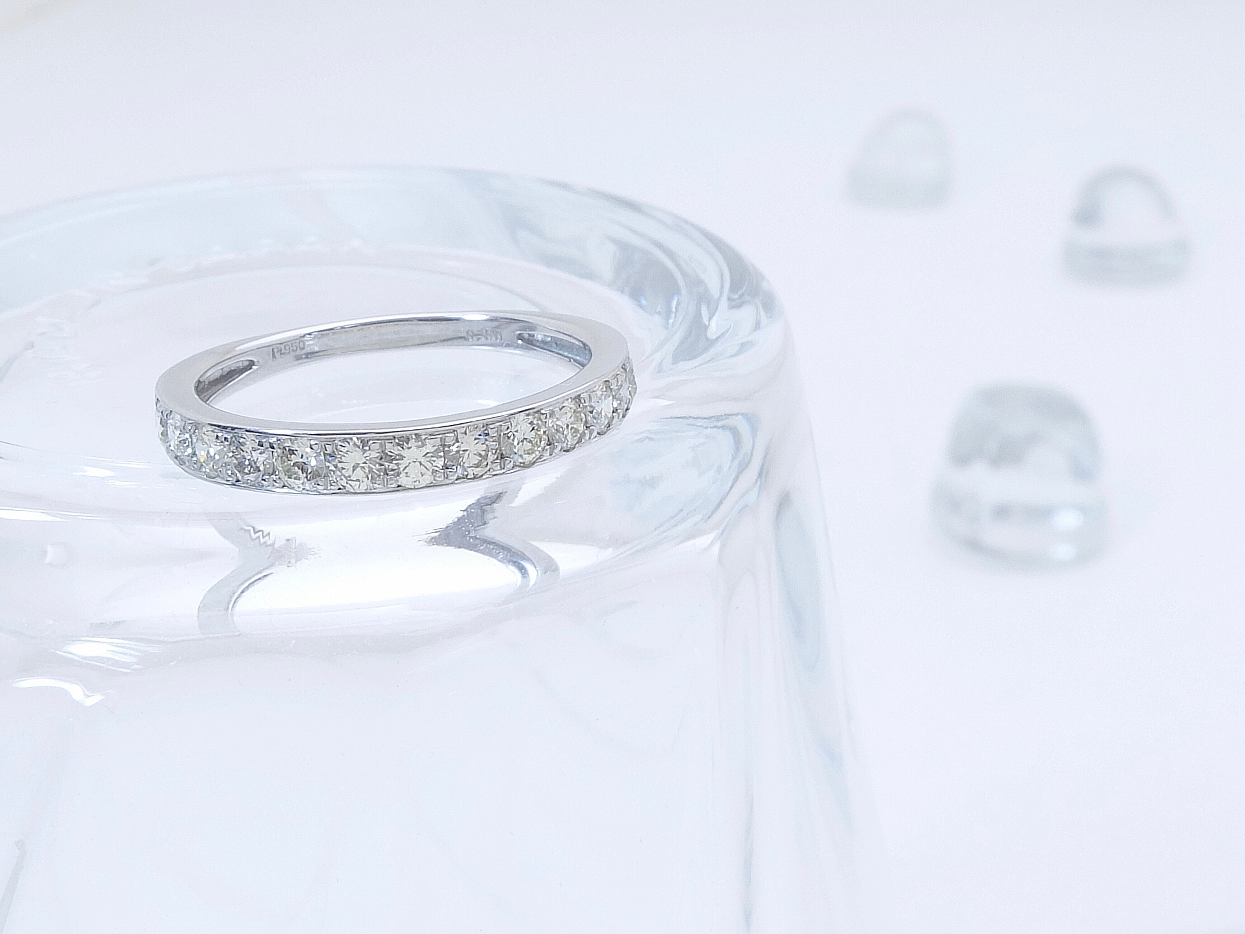 なめらかな着け心地と引っ掛かりの少ない丸爪で留めてお作りするハーフエタニティリング。